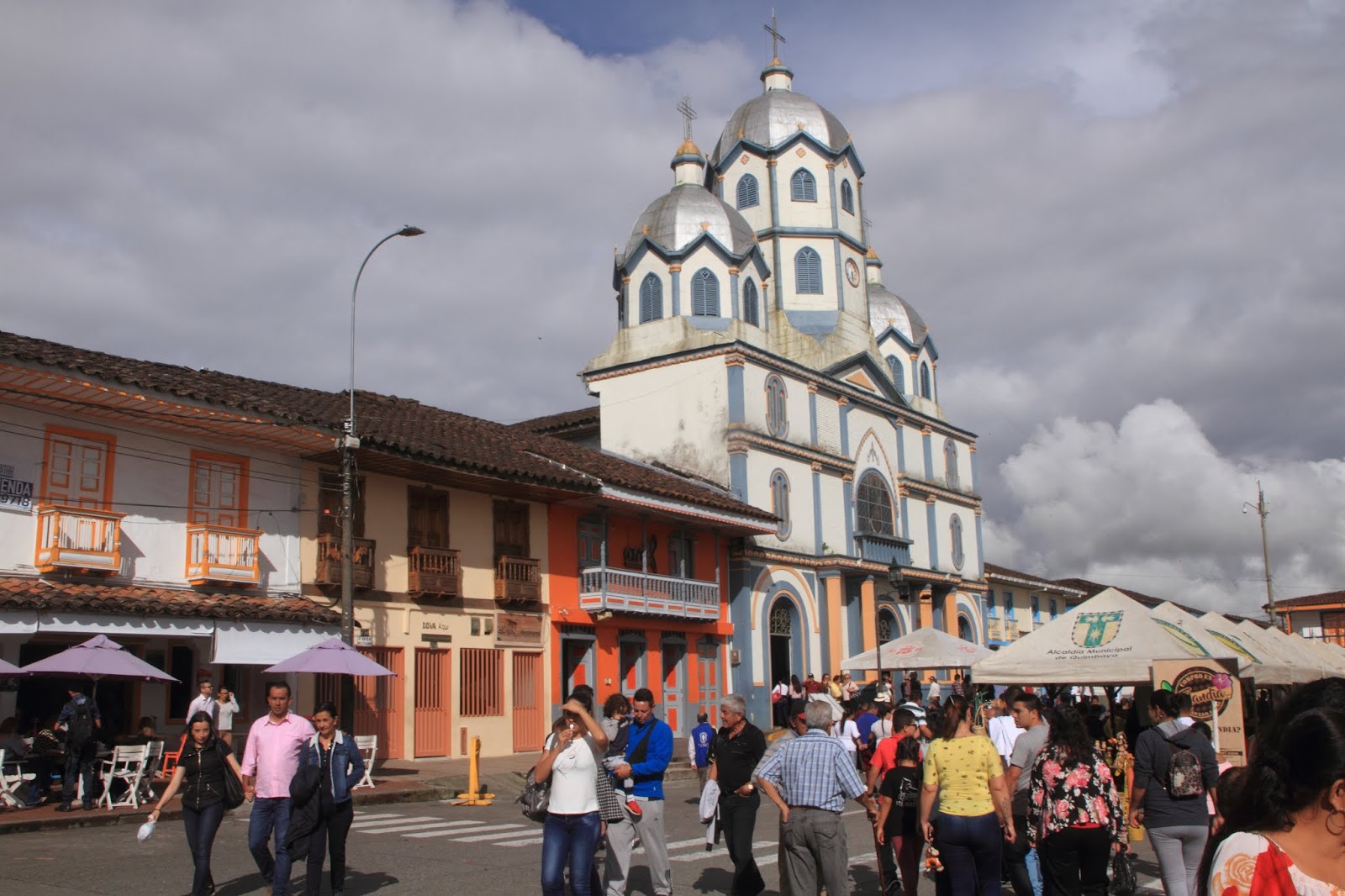 Finalmente una visita a otro de los pueblos de la zona: Filandia. También muy cuidado y agradable. Coincidió un domingo y el ambiente de la plaza era algo típicamente colombiano. Gente de paseo más o menos engalanada, terrazas llenas en las que se puede degustar el café de la zona en múltiples formas, un mercadillo, una procesión rezando el rosario con la imagen de la Virgen…