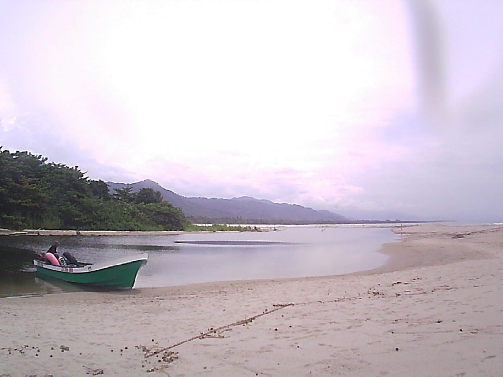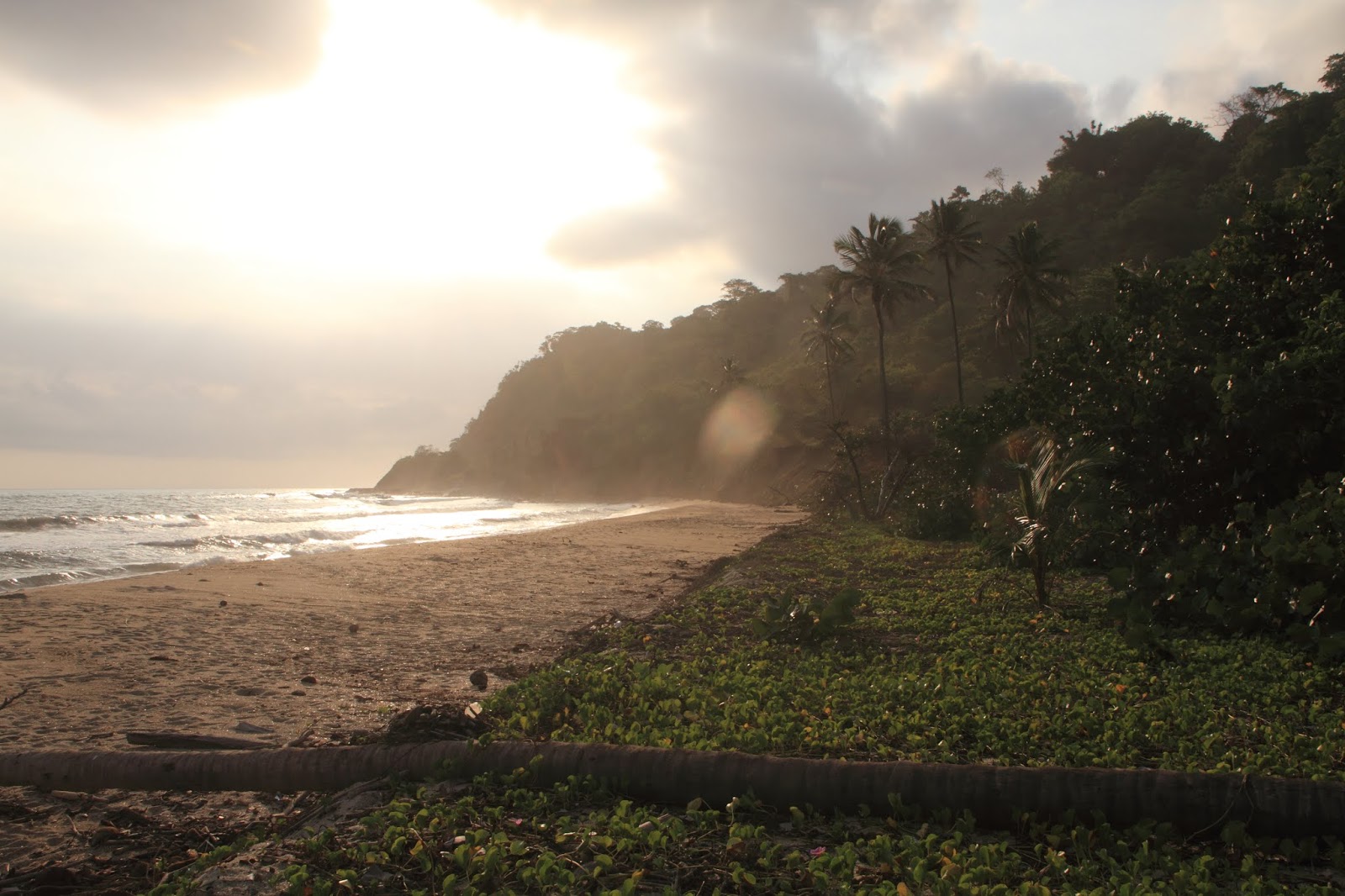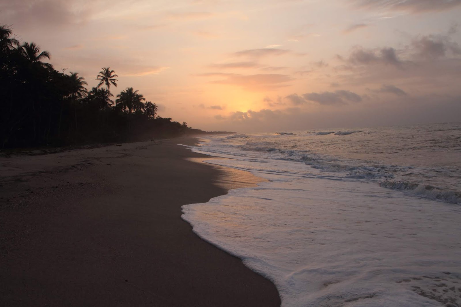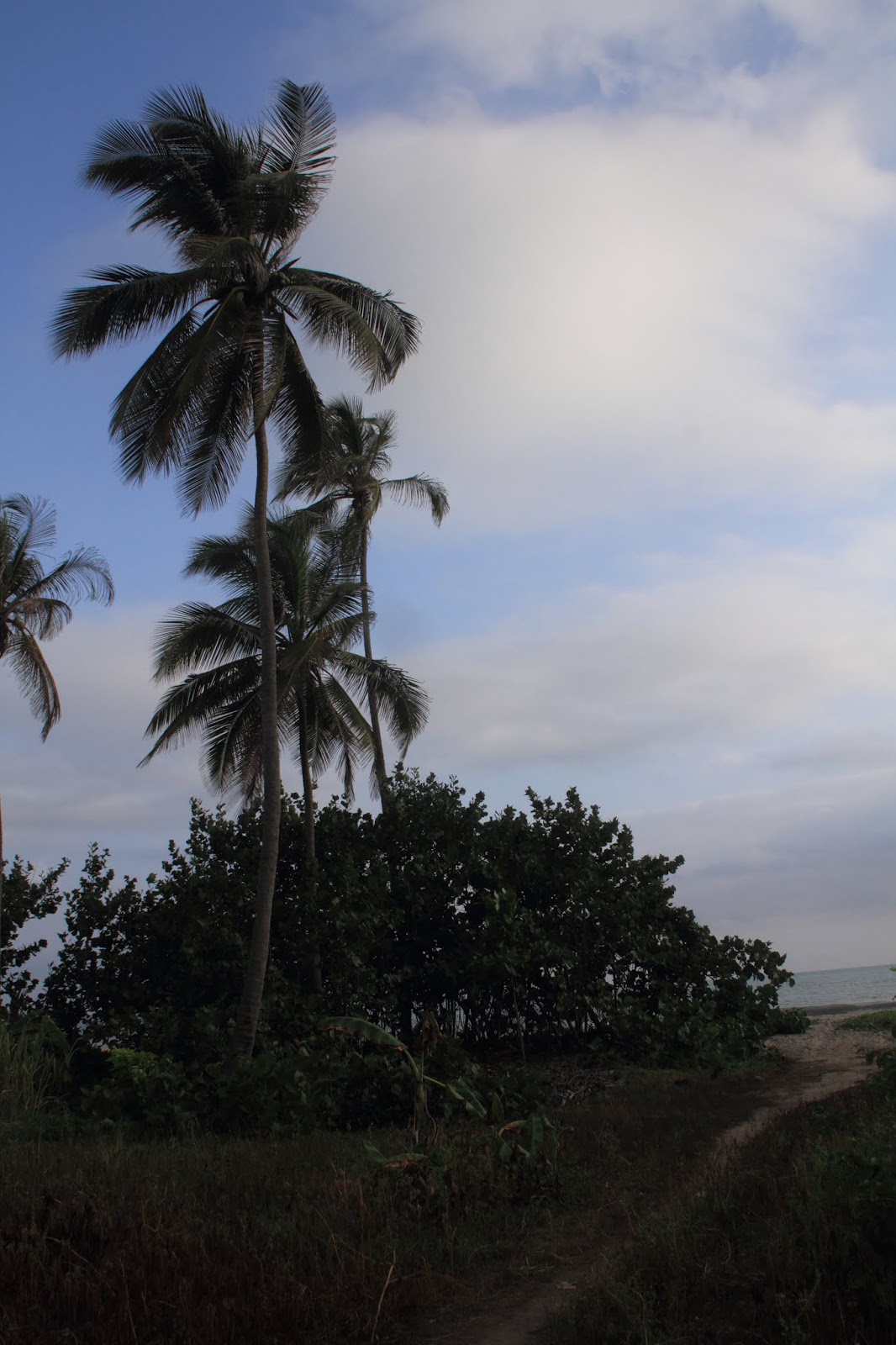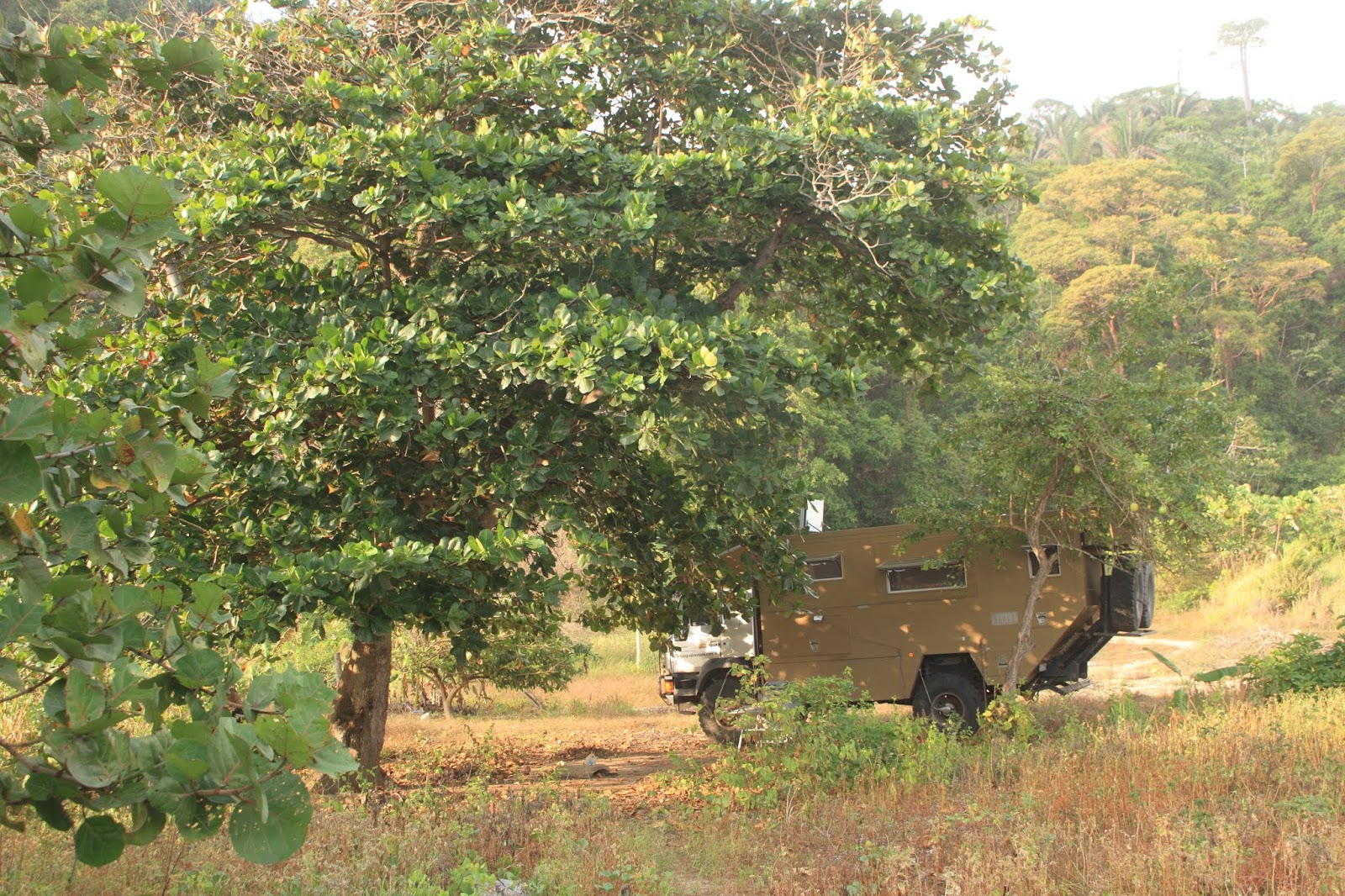 Tras algunos intentos fallidos de encontrar lo que buscábamos, hallamos un acceso a la costa a no más de 80 metros desde la carretera, perfectamente plano y con una gran sombra de lo que aquí llaman almendro (aunque no se parece en nada a los de España) justo al lado del campamento de unos pescadores a los que consultamos y nos dijeron que no había ningún problema aunque la zona aun se pertenecí al Parque. Resultó ser gente muy agradable, un padre y su hijo, César y Rafa, con los que compartimos casi dos semanas en el precioso y tranquilo lugar, únicamente importunados por los mosquitos, que son una auténtica plaga.