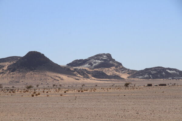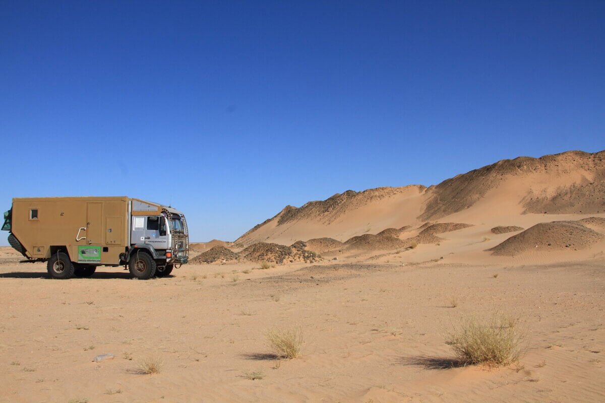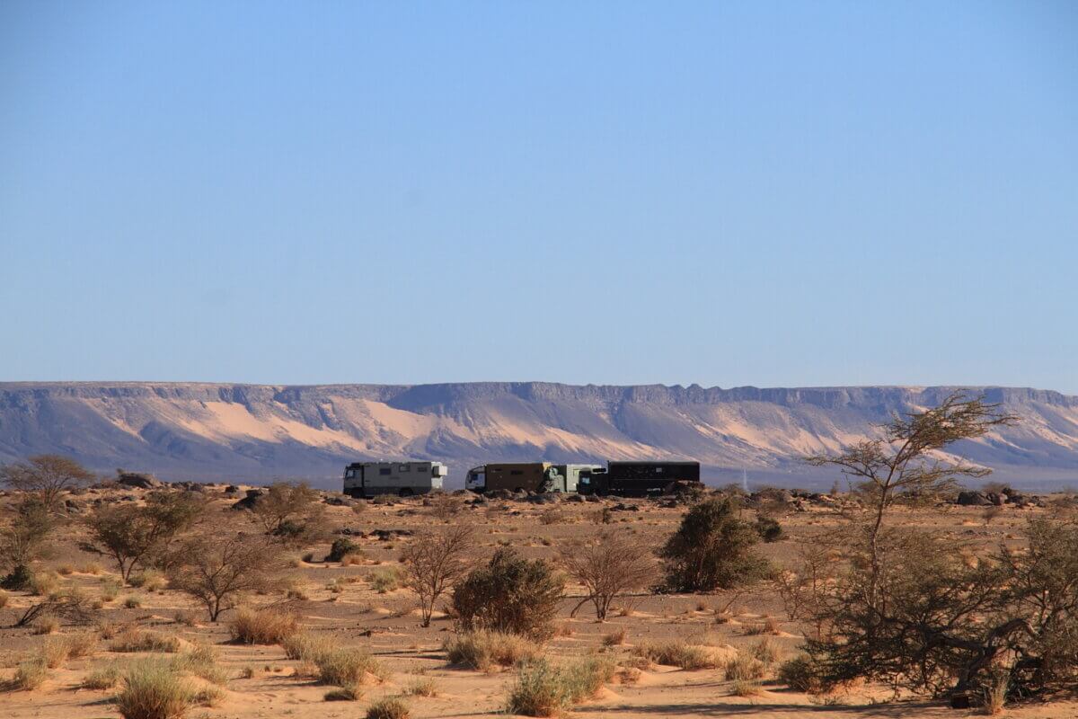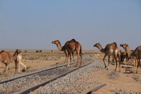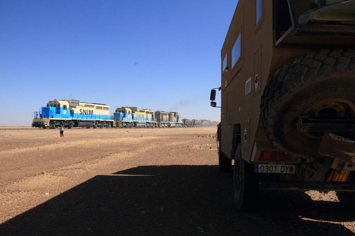 Después de aprovisionarnos de agua y gasoil a tope, en las proximidades de Bou Lanouar tomamos la pista que discurre paralela a la vía del ferrocarril que transporta el mineral desde las minas de Zouerat hasta Nouadhubou. Esta pista nos iba a llevar hasta El monolito de Ben Amira (según parece el segundo por tamaño del mundo), en donde planeábamos hacer un alto de varios días. Siguiendo el planteamiento que nos habíamos fijado, rodábamos desde las nueve de la mañana hasta algo más de mediodía y nos deteníamos en algún entorno particularmente agradable y bonito hasta el día siguiente. De esta forma en cuatro etapas llegamos hasta Ben Amira y acampamos a sotavento de la gran roca (el viento seguía fastidiando a fondo).