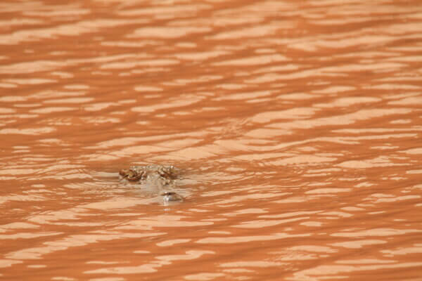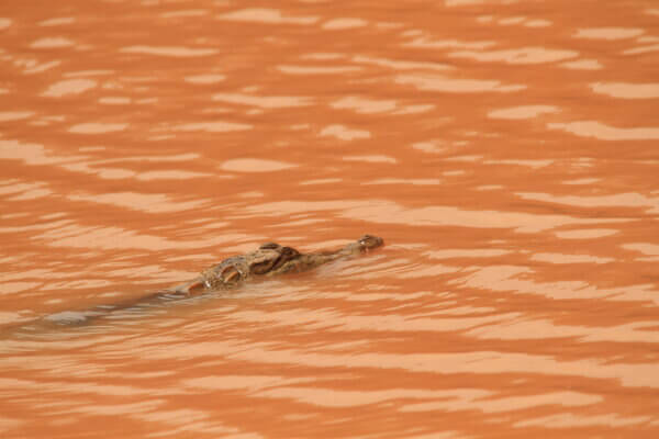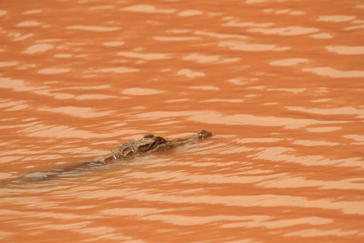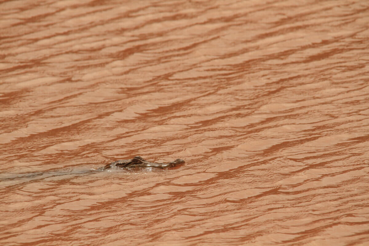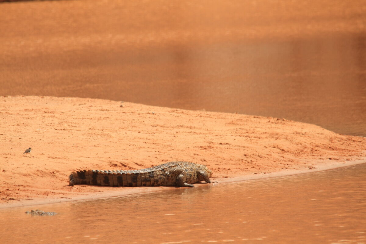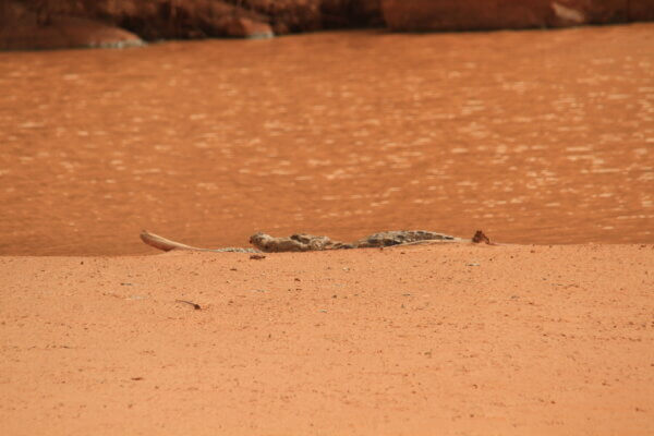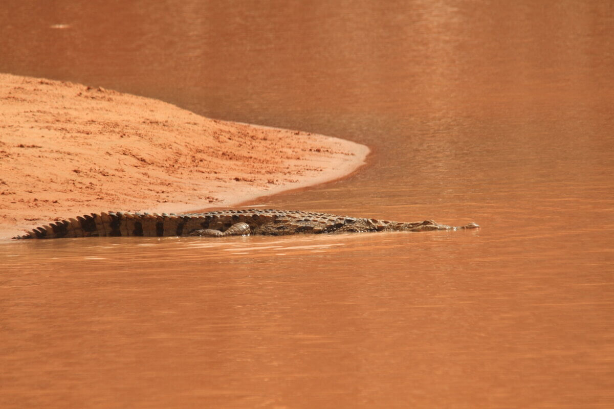 Al llegar a la guelta descubrimos algunos de los reptiles en la orilla, aunque enseguida se internaron en el agua al escuchar ruido. Estuvimos un rato en silencio y empezaron a volver a la playa a tomar el sol y allí tuvimos ocasión de hacer las fotografías de unos bicho respetables a los que calculamos alrededor de dos metro y medio.